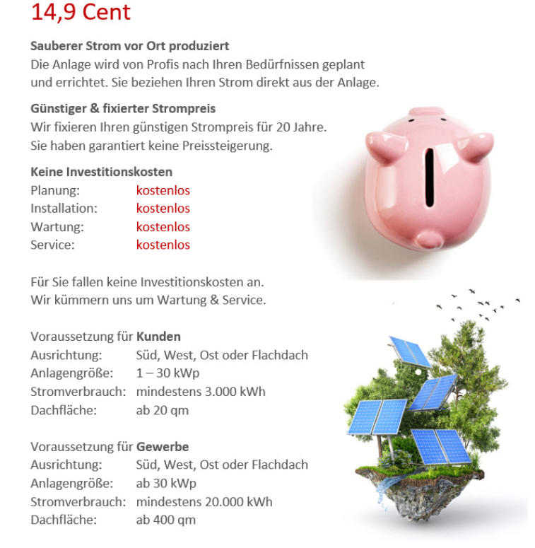 Sie möchten Ihre Stromkosten senken und das Dach Ihres Gebäudes sinnvoll nutzen, scheuen aber den Aufwand und die Kosten einer Photovoltaikanlage? Wir machen’s Ihnen leicht: Sie verpachten Ihr Dach an uns und wir errichten dort eine Anlage, die das Gebäude direkt mit preisstabilem Sonnenstrom versorgt.Unser Engagement, die Photovoltaikanlage zu errichten und zu betreiben, übernimmt alle Pflichten. Um eine nachhaltige Energieerzeugung zu gewährleisten, stellt der/die Gebäudeeigentümer sicher, dass das Dach uns für mindestens 20 Jahre zur Verfügung steht und zusätzliche Verschattungen vermieden werden. So können wir eine ununterbrochene, saubere Energieerzeugung für die Zukunft gewährleisten.